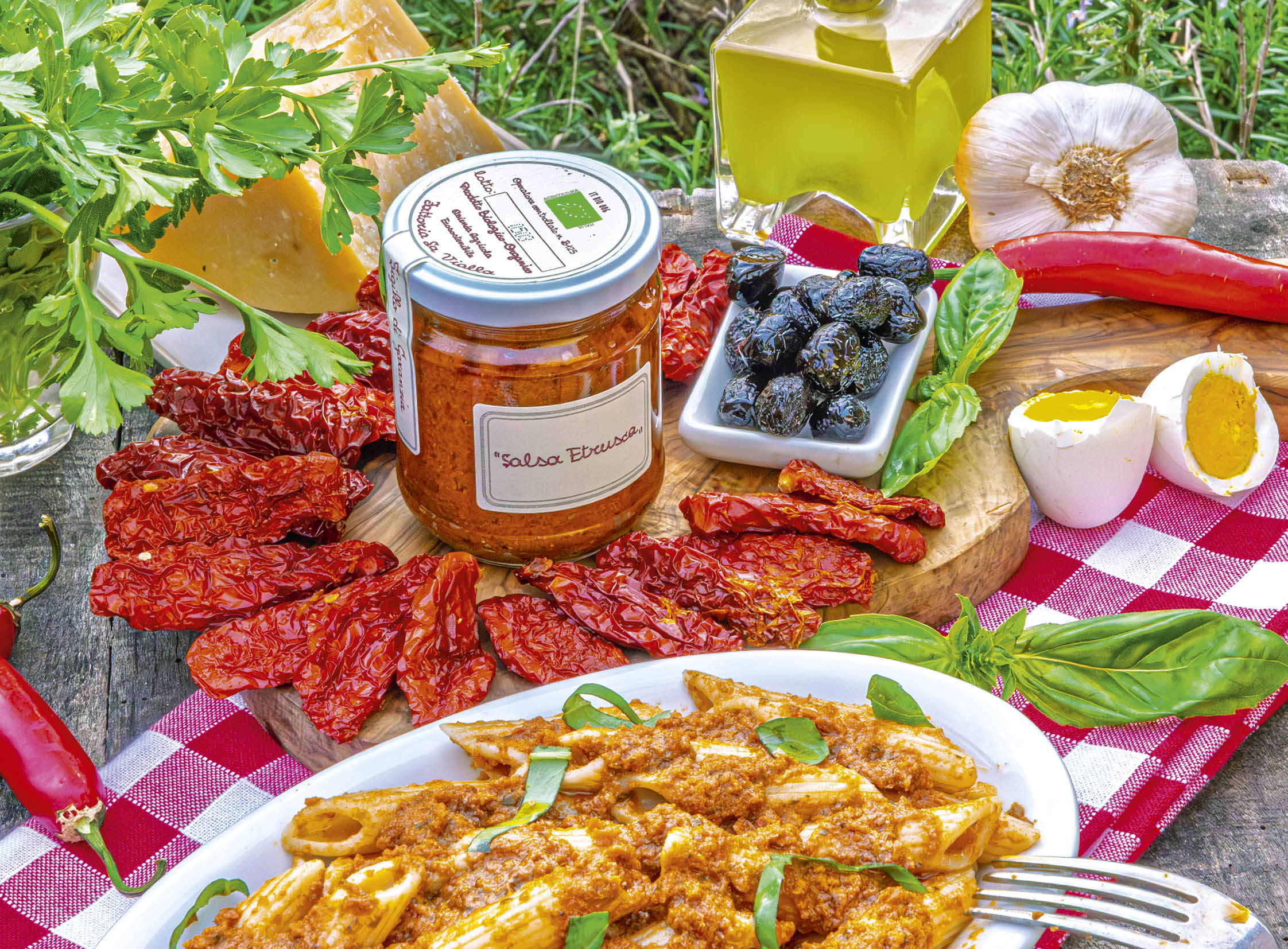 Aus einem schlichten, „uralten“ Rezept - Pecorino, Petersilie, Knoblauch und Öl - unserer etruskischen Vorväter ist diese duftende, pikante und dickflüssige Soße entstanden. Sie wurde um wenige, einfache Zutaten wie zum Beispiel Tomaten bereichert und richtet „geschmackvoll“ Spaghetti, Pici, Tagliatelle, kurze Pasta und Reis an; sie eignet sich auch, um appetitliche Crostini und Bruschette zuzubereiten.