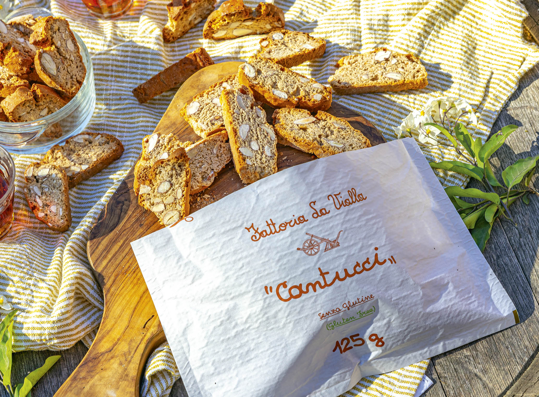 Die glutenfreien Cantucci werden nach einem erprobten Rezept hergestellt: Vollkornreismehl mit den klassischen Zutaten, Mandeln, Rohrzucker, etwas Honig, ein Pinselstrich Eiweiß, um die Kruste schön knusprig zu machen. Sie werden täglich Blech um Blech von Sabina (Antonio Lo Francos Ehefrau) und Franca, ihrer rechten Hand, zubereitet und in den Backofen geschoben.... auch diese Cantucci sind also „hausgemacht“!