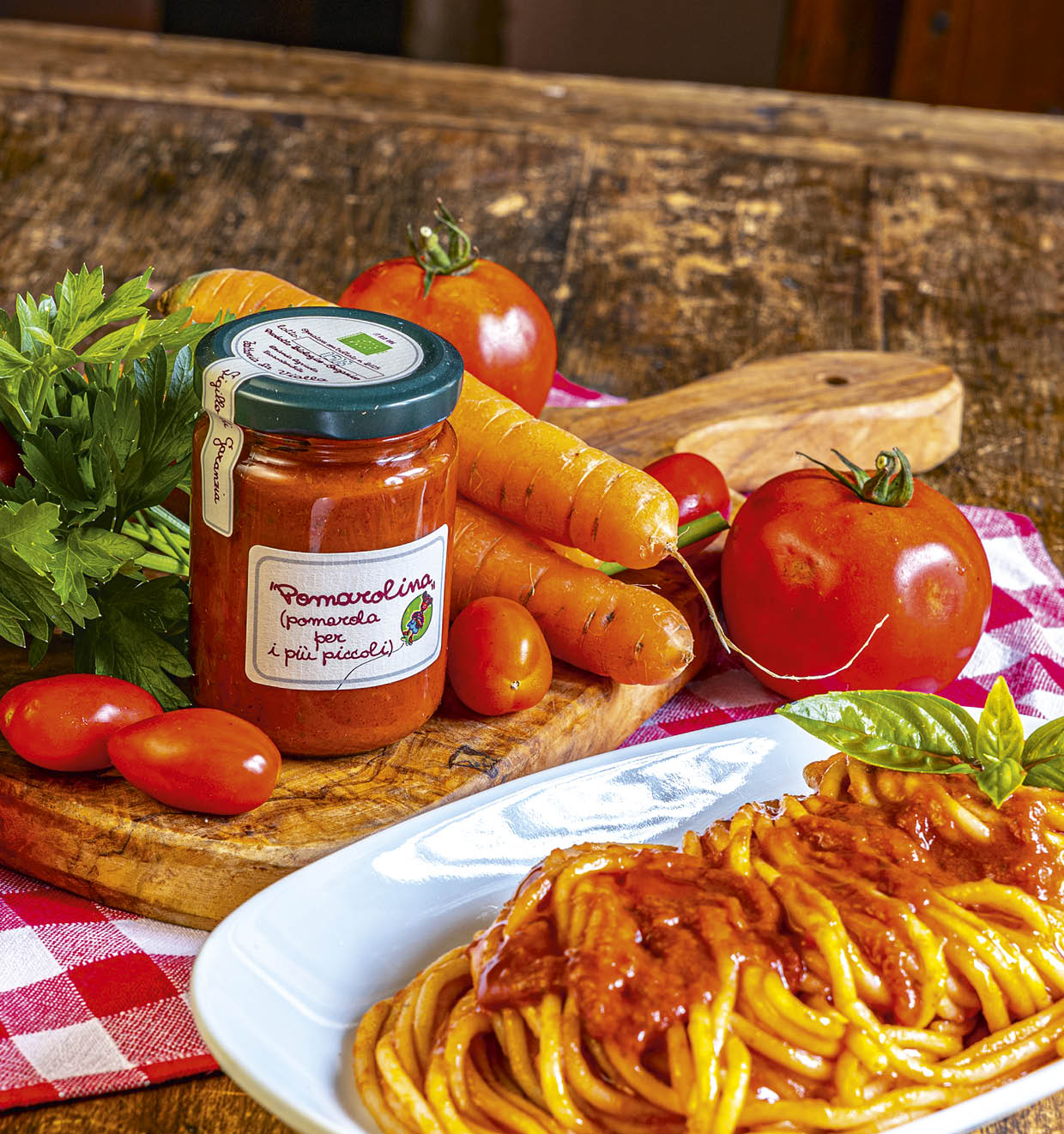 Die Pomarolina ist ein (halbrohes) Püree aus wohl ausgereiften Tomaten, die mit einer „Prise“ fein gehacktem, frischem Gemüse abgeschmeckt werden. Sie wurde für Kinder zwischen einem und drei Jahren entworfen und ausgefeilt. Es ist empfehlenswert (und lecker!), vor dem Servieren 1-2 Teelöffel geriebenen Parmesan oder Pecorino über die angerichteten Nudeln zu streuen, einen Schuss Olivenöl hinzuzufügen..... und sie schmeckt nicht nur den Kleinen, so köstlich und gut bekömmlich, wie sie ist.