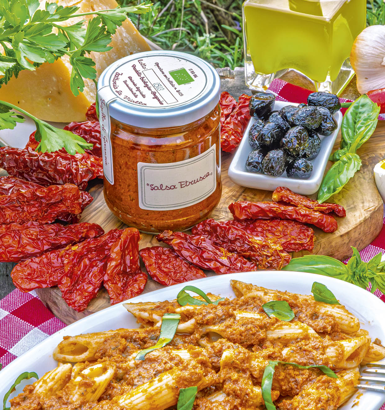 Aus einem schlichten, „uralten“ Rezept - Pecorino, Petersilie, Knoblauch und Öl - unserer etruskischen Vorväter ist diese duftende, pikante und dickflüssige Soße entstanden. Sie wurde um wenige, einfache Zutaten wie zum Beispiel Tomaten bereichert und richtet „geschmackvoll“ Spaghetti, Pici, Tagliatelle, kurze Pasta und Reis an; sie eignet sich auch, um appetitliche Crostini und Bruschette zuzubereiten.