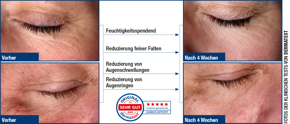 Feuchtigkeitsspendend +37,6% in 4 Wochen1, Reduzierung von Augenringen -21% in 4 Wochen1, Reduzierung von Augenschwellungen -21% in 4 Wochen1, Reduzierung feiner Falten -24% in 4 Wochen1, pflegend, schützend, regenerierend (Anti-Aging).