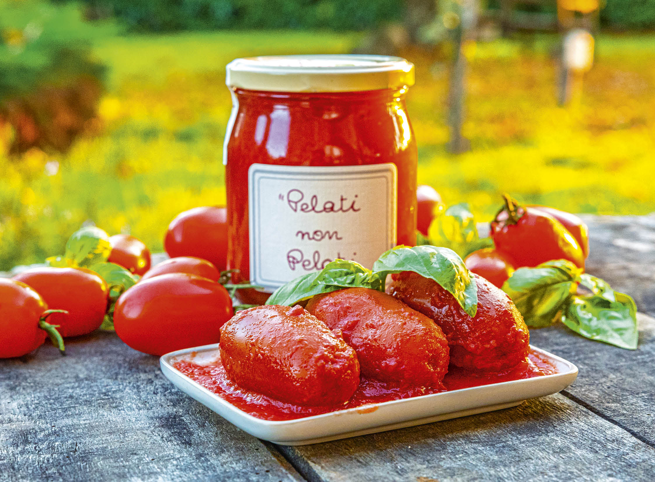 „Am Stück“, duftender und schmackhafter, reicher an Antioxidantien und essenziellen Aminosäuren - zu 52 % in den Schalen (und Samen) der Tomaten enthalten - kann man mit ihnen Soßen zubereiten, Pizza und Bruschette belegen, Calzone füllen, Fleisch oder Gemüse garen und sie wie die geschälten Tomaten verwenden, mit dem Geschmack und der Qualität von frischen Tomaten.