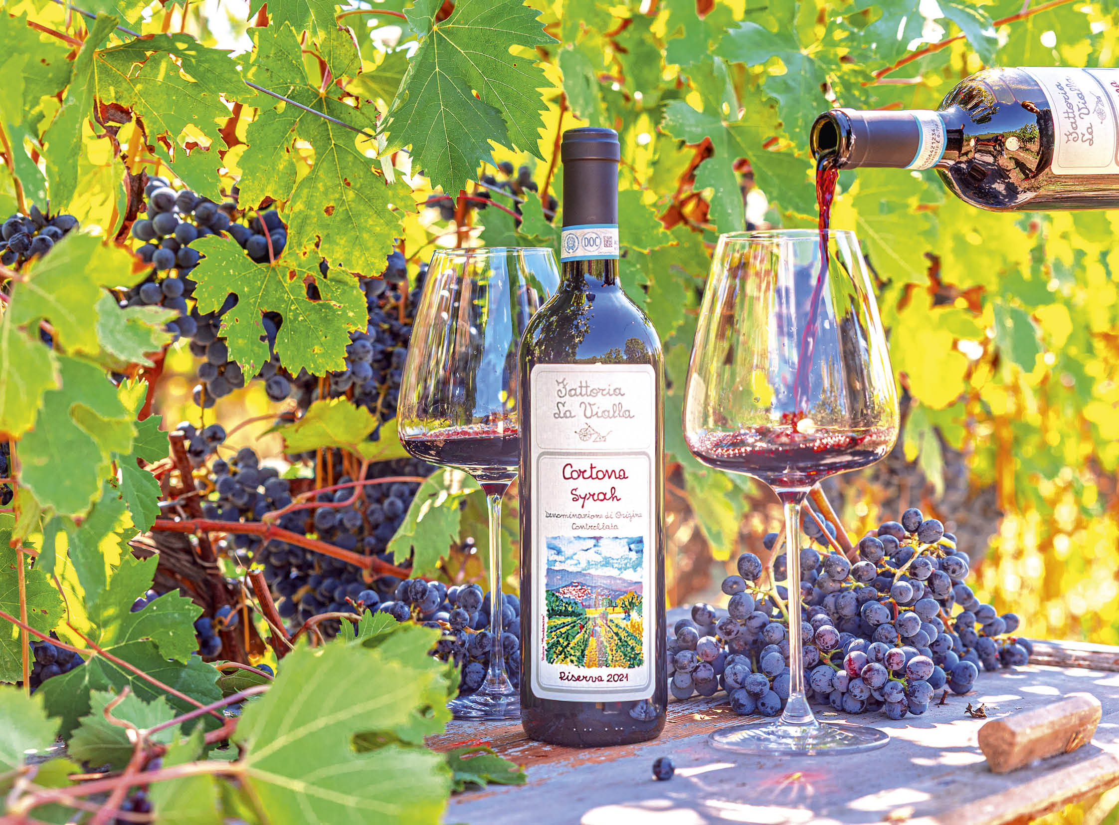 Een internationaal druivenras dat in Toscane - en in de omgeving van het prachtige stadje Cortona! - geschikt terrein heeft gevonden en een niveau van uitmuntendheid heeft bereikt. Uit de wijngaarden van La Vialla aan de voet van dit stadje komt een wijn met elegante, fijne en kruidige aroma’s. Het warme jaar bracht volle, sappige, suikerrijke druiven en de lange maceratie zorgde voor de beste extractie van aroma’s, polyfenolen en anthocyanen. De verfijning, deels in nieuwe tonneaux en deels in barriques die voor de derde keer worden gebruikt, biedt delicate houtachtige aroma’s. Na 24 maanden wordt de wijn geassembleerd, gevolgd door nog een ‘rustperiode’ en ten slotte wordt hij gebotteld.