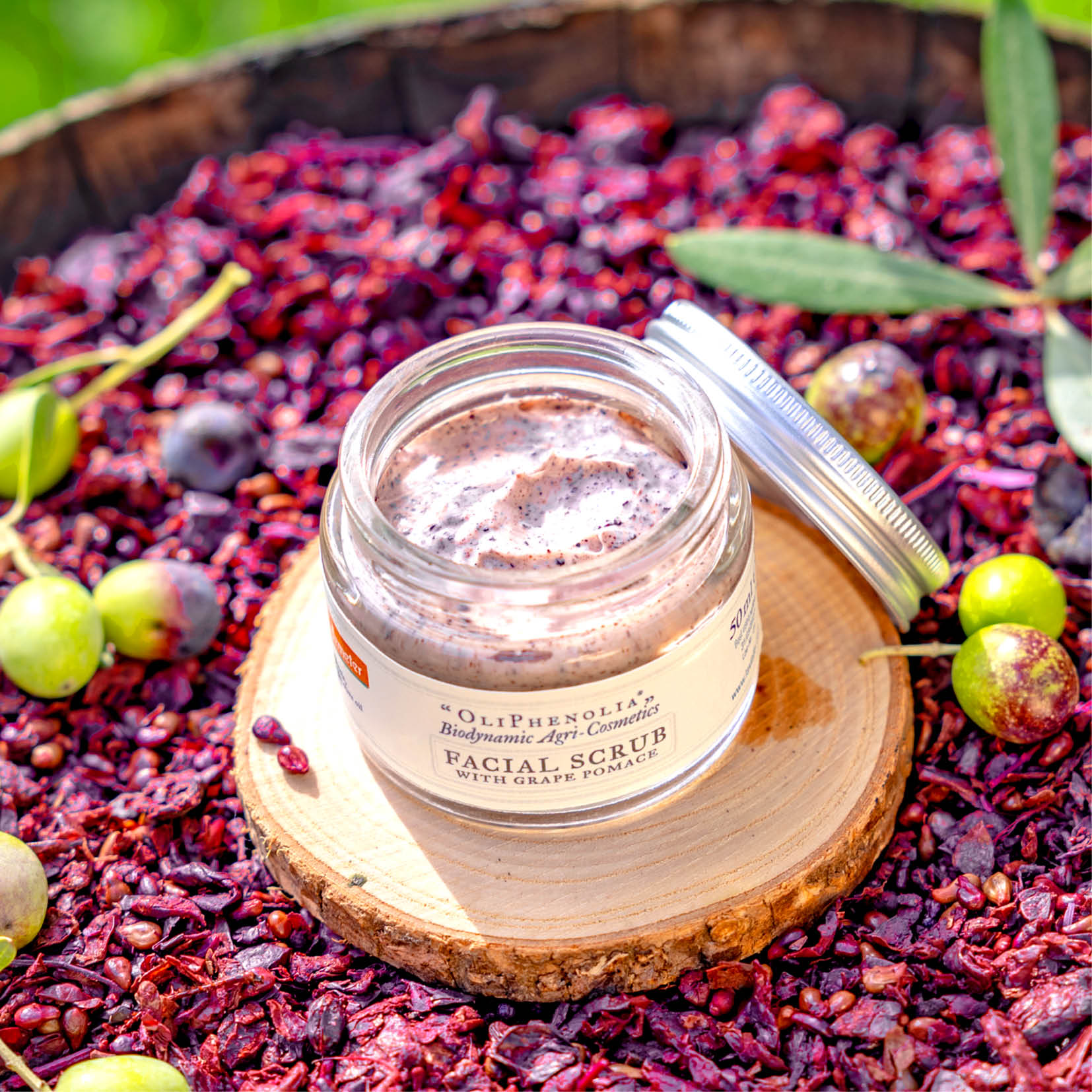 In order to have smooth, glowing, “pure” skin, people often use creams and serums forgetting that, in order to obtain good results, the skin must essentially be cleansed thoroughly. Only when the dry, dead cells are removed regularly (2 to 3 times a week) the skin is ready to absorb the other treatments that we apply. To create La Vialla’s new Facial Scrub, we used a residue from wine production, grape pomace, that’s to say the skins and seeds of the fruit, dried and finely ground.