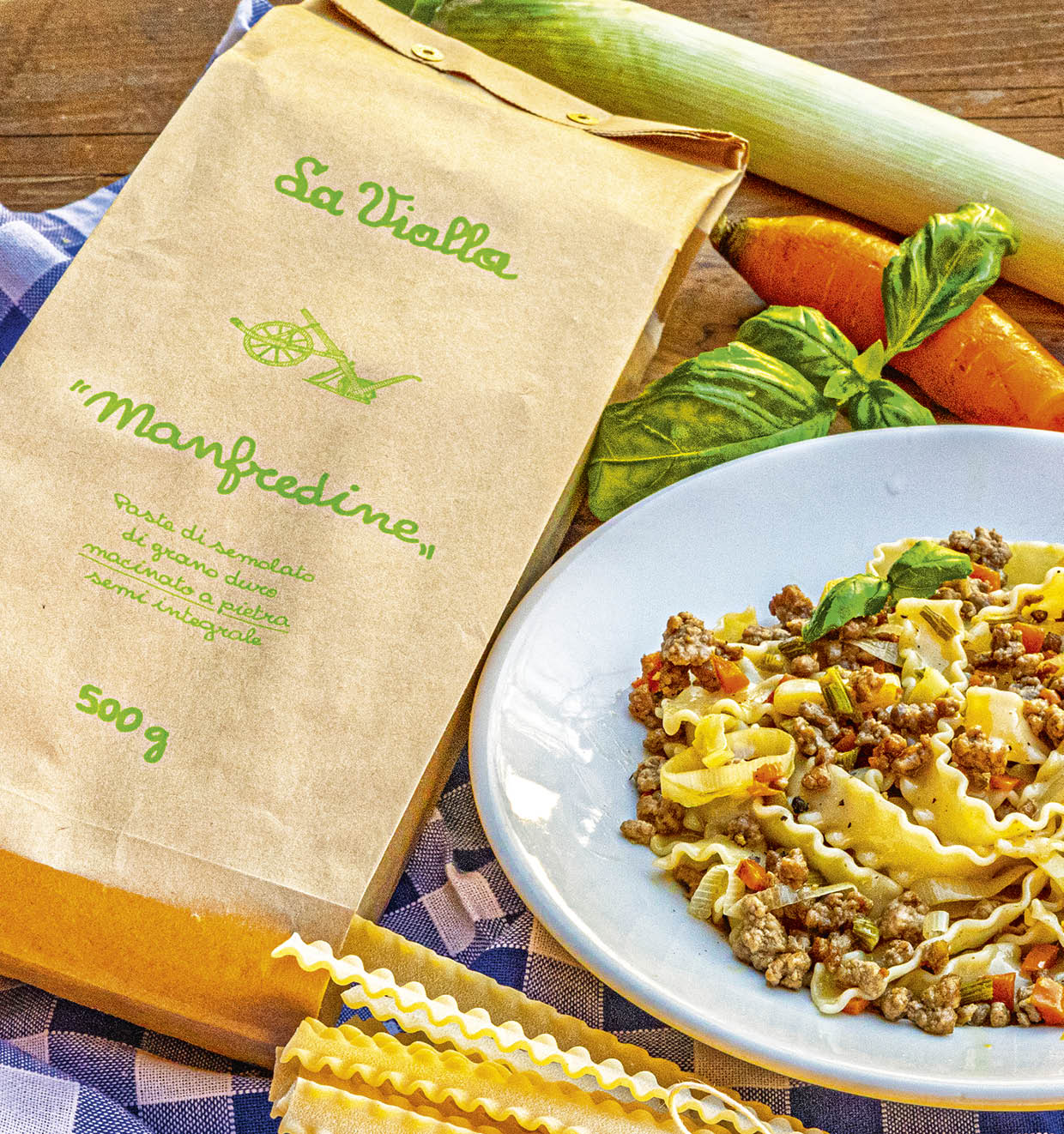 Die Manfredine haben die richtige Form (1) und Konsistenz, um Soßen einzufangen und hervorzuheben, von den einfachsten (wie „Ricotta und Olivenöl“, die Soße, mit der die Sizilianer 1250 die Nudeln für ihren neuen König Manfred von Schwaben anrichteten, nach dem die Pasta benannt ist) bis zu den aufwendigeren (das „Ragù“) und den „nobleren“ (das „Pesto“, Soßen mit Krustentieren oder Fisch). Die Manfredine - aus steingemahlenem Hartweizengrieß - sind auch in große Stücke zerteilt exquisit. Zerbrechen Sie sie in 2-3 Teile, wenn Sie sie in den Topf geben, und alles ist „in Butter“!